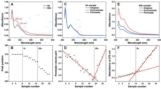 EGCG sample absorbance and membrane permeability changes during incubation. Absorbance spectra of EGCG before and after 80 h of incubation at 60 °C (A) and a shift in its characteristic peak position during the incubation time frame (B). Non-incubated EGCG sample concentrate and permeate absorbance spectra (C). Sample permeate volume part dependence on sample number (D). EGCG sample concentrate and permeate absorbance spectra after 80 h incubation (E). Concentrate absorbance at 270 nm by on sample number (F). Sample preparation and measurement procedures are described in the Section 2.