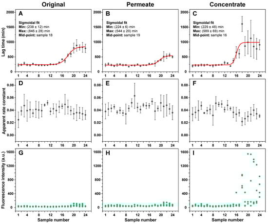 Insulin aggregation kinetic parameters in the presence of different incubation time EGCG samples. Insulin aggregation lag times when in the presence of original (A), permeate (B), and concentrate (C) EGCG samples, their elongation apparent rate constants (D–F respectively), and sample bound-ThT fluorescence intensities at the end of the reaction (G–I respectively). EGCG sample preparation is described in the Section 2. Aggregation lag time, apparent rate constant, and sample fluorescence intensity values were determined as shown in Appendix A, Figure A1 (n = 4, error bars are for one standard deviation). Examples for aggregation kinetic curves of samples 1 and 24 are shown in Appendix A, Figure A3. Inserts in subfigures (A–C) show the minimum and maximum lag time values and mid-point of the sigmoidal fit.