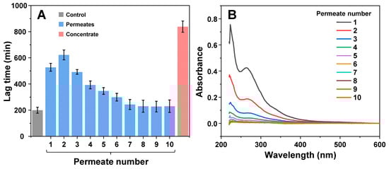 Effect of EGCG solution permeates and remaining concentrate on insulin aggregation after multiple rounds of concentration and dilution. The aggregation kinetics (A) and permeate absorbance spectra (B) scans were performed as described in the Section 2. Lag time values were determined from four repeats (error bars are for one standard deviation). Absorbance spectra are the average of three repeats.