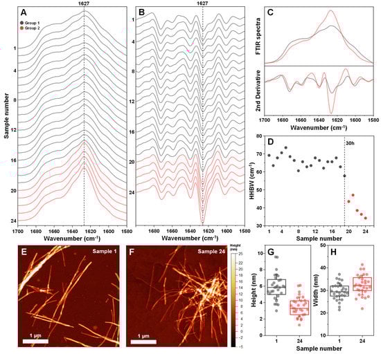 Fourier-transform infrared (FTIR) spectra and atomic force microscopy (AFM) images of insulin fibrils, generated using different incubation time EGCG samples. Twenty-four different insulin fibril FTIR spectra (A) and their second derivatives (B), prepared using a range of different incubation time EGCG samples. Samples are divided into two groups (group 1–grey color, group 2–red color) based on differences in their FTIR spectra. Comparison of both group FTIR spectra and their second derivatives (C). Half-height bandwidth (HHBW) of all 24 FTIR spectra (D). AFM images of sample 1 (E) and sample 24 (F) insulin fibrils and their respective cross-sectional height (G) and width (H) distribution (n = 30). FTIR spectra and AFM image acquisition is described in the Section 2. Different group spectra and data points are color-coded in all subfigures.