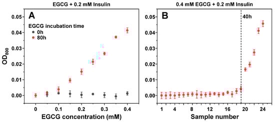 Since it has been reported that EGCG can cause insulin precipitation, which may factor into the observed inhibitory effect, the interaction between protein and inhibitor molecules was observed by scanning sample optical densities at 800 nm (OD800). When non-aggregated insulin was combined with non-incubated EGCG, there were no notable changes in sample OD800 values (Figure 5A), even when the concentration of EGCG was increased to 400 µM (16 times higher than used in the aggregation assay). Matters became significantly different when the same examination was carried out with the 80-h incubation sample (Figure 5A). There appeared to be an almost linear dependence between the concentration of added EGCG and the sample optical density, indicating that molecules present in the inhibitor sample cause concentration-dependent precipitation of insulin. Without insulin, the same concentration of EGCG (400 µM) resulted in an OD value within the margin of the control, and only the 10 mM (25 times higher concentration) original 80-h incubation sample had a comparable optical density (Appendix A, Figure A2B).