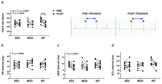 Exercise training induced a resting heart rate decrease. Individually paired data of electrocardiograms previous (PRE) and posterior (POST) to the training period. (a) Heart rate and paired electrocardiograms of a representative INT mouse with indication of RR interval; (b) PR interval; (c) QRS interval; (d) QTc interval. Experimental groups: SED, sedentary; MOD, moderate training; INT, high-intensity training. Values are individual mouse data for each group ((a,b) SED n = 11, MOD n = 9, INT n = 10; (c,d) SED n = 11, MOD n = 8, INT n = 10). ANOVA statistics: Ex, factor exercise; Ti, factor time. Bonferroni test *** p < 0.001.