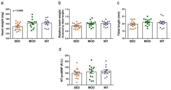 Heart weights as direct data and data normalized by tibial length are shown in Figure 3a,b, respectively. Tibial length was not modified by physical exercise treatments, as shown in Figure 3c. Therefore, it was a more consistent factor to normalize heart weight than body weight. Heart weight increased with the exercise training according to one-way ANOVA, although there were no differences between group means by post hoc analysis. Significance was reduced to borderline in the calculated ratio with tibial length (ANOVA, p = 0.0611). Cardiac hypertrophy was mild in both exercise groups, with heart weight increases of 13.5% and 14.9% in MOD and INT mice, respectively. To further assess putative cardiac changes, NT-proBNP circulating levels were quantified but no differences were detected between groups (Figure 3d).