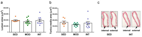 The analysis of the aorta morphology performed with tissue slides microscopical images did not detect any effect of exercise training. Measures of the lumen and tunica media thickness are shown as example of absence of gross aortic changes in Figure 4a,b, respectively. Representative images of the descending aorta sections for SED and INT groups used for measurement after picrosirius red staining are shown in Figure 4c. No statistical effect of the exercise regimens was obtained. However, a generally higher variability was shown into the INT animal group.