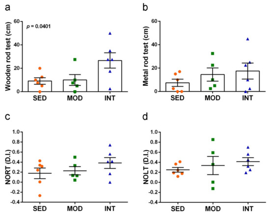 Exercise training improved motor coordination and maintained learning and memory skills. (a) Distance traveled on a squared wooden rod; (b) distance traveled on a round metal rod; (c) discrimination index (D.I.) in the novel object recognition test (NORT); (d) discrimination index (D.I.) in the novel object location test (NOLT). Experimental groups: SED (orange circles), sedentary; MOD (green squares), moderate training; INT (blue triangles), high-intensity training. Values are mean ± SEM ((a–d) SED n = 6, MOD n = 5, INT n = 6). Statistics: There was a significant ANOVA effect of exercise treatment in (a) without post hoc test significance.