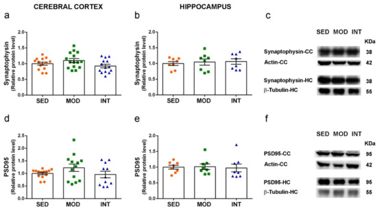 Synaptic markers synaptophysin and PSD95 were not modified by exercise in young mice. (a–c) Levels of synaptophysin in the cerebral cortex (CC) and hippocampus (HC), as indicated, and representative blots of experimental groups; (d–f) levels of PSD95 in cerebral cortex and hippocampus and representative blots. Experimental groups: SED (orange circles), sedentary; MOD (green squares), moderate training; INT (blue triangles), high-intensity training. Values are mean ± SEM ((a) SED n = 14, MOD n = 15, INT n = 14; (b,e) SED n = 8, MOD n = 8, INT n = 8; (d) SED n = 14, MOD n = 13, INT n = 11).
