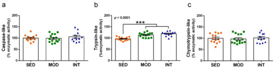 Proteolytic activity of the proteasome was increased by exercise. Caspase-like enzymatic activity (a), trypsin-like activity (b), and chymotrypsin-like activity (c) were determined in cerebral cortical tissue. Experimental groups: SED (orange circles), sedentary; MOD (green squares), moderate training; INT (blue triangles), high-intensity training. Values are mean ± SEM ((a) SED n = 13, MOD n = 15, INT n = 12; (b) SED n = 13, MOD n = 14, INT n = 12; (c) SED n = 14, MOD n = 15, INT n = 12). Statistics: There was a significant ANOVA effect of exercise treatment in (b) with post hoc test *** p < 0.001 for both MOD and INT in comparison to the SED group.
