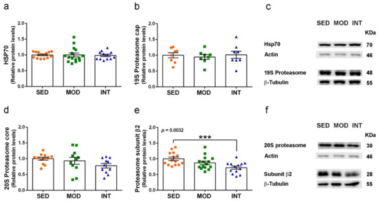 Protein levels of proteasome subunits were modified by exercise. HSP70 (a), 19S proteasome cap (b), and representative blots of each experimental group (c); 20S proteasome core (d) proteasome subunit β2 (e) and representative blots (f). Proteins were determined in cerebral cortical tissue. Experimental groups: SED (orange circles), sedentary; MOD (green squares), moderate training; INT (blue triangles), high-intensity training. Values are mean ± SEM ((a) SED n = 14, MOD n = 15, INT n = 12; (b) SED n = 8, MOD n = 8, INT n = 8; (d) SED n = 12, MOD n = 11, INT n = 11; (e) SED n = 14, MOD n = 15, INT n = 13). Statistics: There was a significant ANOVA effect of exercise treatment in (f) with post hoc test *** p < 0.001 in comparison to the SED group.