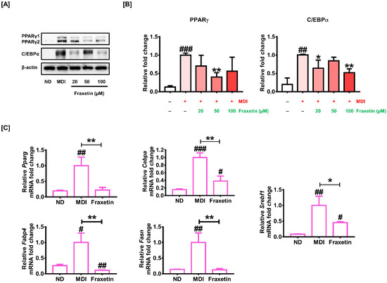 Effect of fraxetin on the expression levels of adipogenesis-related proteins and genes in 3T3-L1 cells. (A,B) Protein expression levels of PPARγ and C/EBPα were assessed with Western blot analysis. The 3T3-L1 cells were incubated with or without fraxetin (20, 50, and 100 µM) for differentiation. Then, the cells were lysed, and a Western blot was performed. The protein levels of PPARγ and C/EBPα were normalized with β-actin. The different colors in bar graph represent the different concentration of fraxetin. (C) The transcriptional expressions of Pparg, Cebpa, Fabp4, Fasn, and Srebf1 genes were determined by RT-qPCR. GAPDH was used for the normalization of each gene expression. All experiments were performed at least three times. The asterisk symbol represents significant differences between the differentiated group and others (* p < 0.05, ** p < 0.01). The crosshatch mark represents significant differences between the nondifferentiated group and others (# p < 0.05, ## p < 0.01, ### p < 0.001), as verified using unpaired t-tests or one-way analysis of variance (ANOVA), followed by Dunnett’s post hoc analysis.