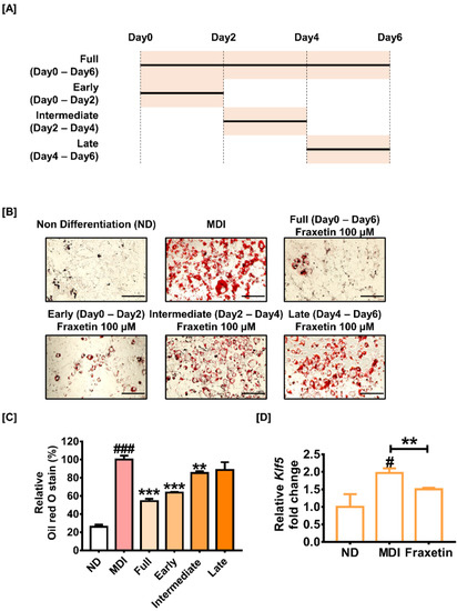 Effect of fraxetin on various stages of adipogenesis in 3T3-L1 cells. (A) Schematic diagram of the treatment period of fraxetin (100 µM) in confluent 3T3-L1 cells during adipogenesis. (B,C) The nondifferentiated cell and differentiated cells treated with fraxetin (100 µM) at different periods of adipogenesis were stained with oil red O solution on day 8. Relative lipid droplets eluted by isopropanol were quantified by measuring the absorbance at 490 nm. Scale bar: 50 µm. (D) Transcriptional expression of the Klf5 gene was analyzed by RT-qPCR. All data were obtained in triplicate. The asterisk symbol represents significant differences between the MDI-treated group and others (** p < 0.01, *** p < 0.001). The crosshatch symbol represents significant differences between the nondifferentiated group and others (# p < 0.05, ### p < 0.001), as verified using unpaired t-tests or one-way analysis of variance (ANOVA), followed by Dunnett’s post hoc analysis.