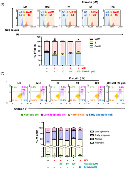Fraxetin triggers cell-cycle shifts without apoptotic cell death. (A) Preadipocytes were incubated with diverse doses of fraxetin in an MDI induction medium for 2 days. After fixation, cells were stained by PI-retaining ribonuclease A and evaluated using flow cytometry. Each value in the histogram was determined by counting 10,000 events. The ratio of cells at each phase was represented in each histogram. (B) The impact of fraxetin with respect to apoptosis in MDI-treated cells was evaluated with Annexin V and PI double-staining assay. Confluent preadipocytes were incubated with different concentrations of fraxetin in an MDI induction medium for 2 days. Cells were treated by PI and Annexin V and assessed by flow cytometry. The number of cells in each dot plot was 10,000. All data were obtained in triplicate. The crosshatch mark indicates significant differences among the nondifferentiated group and others (# p < 0.05). The asterisk symbol represents significant differences between the MDI-treated group and others (* p < 0.05), as verified using one-way analysis of variance (ANOVA), followed by Dunnett’s post hoc analysis.
