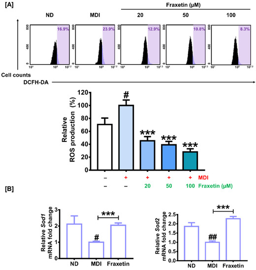 Effect of fraxetin on ROS production and the transcriptional expression of scavenging genes during the adipogenesis of 3T3-L1 cells. (A) ROS production was evaluated with DCFH-DA using flow cytometry. Relative ROS production is represented as purple shadow in a bar graph. The different colors in bar graph represent the different concentration of fraxetin. (B) The mRNA expressions of scavenging genes (Sod1, Sod2) were analyzed with RT-qPCR. Each gene was normalized with the GAPDH gene. All data were obtained in triplicate. The asterisk indicates significant differences between the MDI-treated group and others (*** p < 0.001). The crosshatch symbol represents significant differences between the nondifferentiated group and others (# p < 0.05, ## p < 0.01), as verified using unpaired t-tests or one-way analysis of variance (ANOVA), followed by Dunnett’s post hoc analysis.