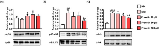 Effect of fraxetin on the regulation of adipogenesis through MAPK signaling. The protein expressions of the MAPK signaling pathway, including (A) p38, (B) Erk1/2, and (C) Jnk phosphorylation, were analyzed with Western blotting. Each phosphorylation level was normalized with each total protein level. All data were obtained in triplicate. The asterisk symbol represents significant differences between the MDI-treated group and others (* p < 0.05, ** p < 0.01). The crosshatch symbol represents meaningful differences among the nondifferentiated group and others (## p < 0.01, ### p < 0.001), as verified using one-way analysis of variance (ANOVA), followed by Dunnett’s post hoc analysis.