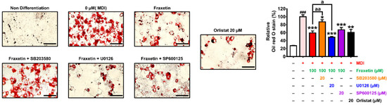 Effect of the combination of fraxetin and MAPK inhibitors on lipid accumulation. Fraxetin was cotreated with MAPK signaling inhibitors including SB203580, U0126, and SP600125 in the presence of an MDI induction medium. Then, the formation of lipid droplets was evaluated with oil red O solution. Relative staining rates were assessed by measuring the optical density at 490 nm. Scale bar: 50 µm. The red and black color represent the treatment with fraxetin and orlistat in the presence of MDI medium, respectively. The orange, blue, and purple colors in bar graph indicate the treatment with SB203580, U0126, and SP600125 in the presence of fraxetin, respectively. Experiments were performed at least three times. The crosshatch represents significant differences between the nondifferentiated group and others (### p < 0.001). The asterisk symbol represents significant differences between the MDI-treated group and others (* p < 0.05, ** p < 0.01, *** p < 0.001). The symbol “a” (p < 0.05) and “aa” (p < 0.01) represent the significant effect of combination treatment between the fraxetin and MAPK-inhibitor-treated groups, as verified using one-way analysis of variance (ANOVA), followed by Dunnett’s post hoc analysis.