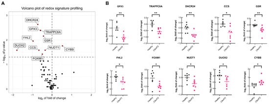 Expression of redox signature is impaired in leukocytes from C9orf72 patients. mRNA levels for redox genes were determined with qRT-PCR in leukocyte RNA from healthy donors (n = 7) or C9orf72 ALS patients (n = 7) and normalized using the geometric mean of the levels of the ACTB, B2M, GAPDH, HPRT1 and RPLP0 as housekeeping genes. (A) Volcano plot depicting the mean log2 of the fold of change of each tested gene and −log10 p-value between C9orf72 and healthy individuals. Horizontal dashed line indicates p < 0.05, and vertical dashed line indicates log2 fold of change = 0. (B) log2 fold of change of the expression of the genes with statistically significant changes in each individual. Horizontal bars indicate the mean log2 fold of change value for the mRNA levels in each group and error bars indicate the SEM. Individual points indicate the expression of that gene in each individual. Statistical analysis was performed with the Wilcoxon rank-sum non-parametric test. * p < 0.05; **, p < 0.01 comparing ALS vs. control group.