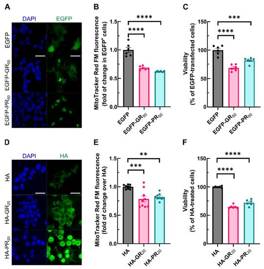 The hallmark of C9orf72-related pathology is the transcription of hexanucleotide expansions that produce toxic dipeptide repeat proteins. In a reverse translational approach, we aimed to correlate the redox alterations in C9orf72-ALS patients with this pathological mechanism in a simplified model of DPR expression using cultured the NSC34 motor neuronal cell line. NSC34 cells were transfected with expression vectors for either enhanced green fluorescent protein (EGFP), or EGFP fused to a 50-long dipeptide repeat of poly-GR (EGFP-GR50) or poly-PR (EGFP-PR50). EGFP immunofluorescence was analyzed 48 h following transfection. EGFP exhibited a diffuse pattern of expression in both cytosol and nuclei, whereas EGFP-GR50 and EGFP-PR50 were preferentially accumulated in nuclear dots (Figure 2A), mimicking the characteristic accumulation in nucleolar structures of DRPs []. Since mitochondria are a central organelle for redox biology, first, we attempted to address the impact of Arg-DPRs on mitochondrial membrane potential (ΔΨm). A flow cytometry evaluation of ΔΨm with MitoTracker Red FM revealed that the overexpression of EGFP-GR50 or EGFP-PR50 reduced the mitochondrial potential by 30% compared to EGFP-cells (Figure 2B). As an alternative approach, and by taking advantage of the cell-penetrating properties of arginine-containing peptides [], we conducted similar experiments in this cell line submitted to 6 μM of either HA control peptide, HA-tagged 20-long dipeptide repeat poly-GR (HA-GR20) or poly-PR (HA-PR20). Immunodetection with anti-HA antibodies showed puncta accumulation of HA-GR20 and HA-PR20 in agreement with previous reports [,] (Figure 2D). When NSC34 cells were exposed to HA-GR20 or HA-PR20 peptides during 24 h, a 20% drop in MitoTracker Red FM fluorescence was observed in HA-GR20 or HA-PR20 compared to HA-treated cells (Figure 2E). Since a long-lasting drop in ΔΨm may induce cell death, we evaluated cell viability with an MTT assay. A reduction in the formazan signal, measured with the MTT assay, may derive from an increase in cell death but also an inhibition in proliferation. For this reason, we validated that the Arg-DPRs did not modify NSC34 cell cycle progression by analyzing EdU incorporation and DNA content. Although cell cycle was not altered in any condition, there was an increase in the percentage of cell death upon Arg-DPRs exposure, which we found by analyzing Annexin-V-FITC and Propidium Iodide (IP) staining (Supplementary Materials; Figure S1). As shown in Figure 2C, the overexpression of EGFP-GR50 and EGFP-PR50 reduced the survival rate by 40% compared with EGFP-transfected cells. Accordingly, HA-GR20 and HA-PR20 reduced the survival rate to the same extent compared with HA-treated cells (Figure 2F). Taken together, these findings link cellular death with a decrease/reduction in the mitochondrial membrane potential induced by Arg-DPRs.