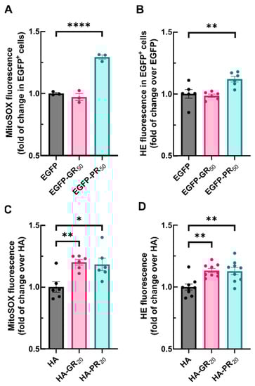 DPRs exposure leads to mitochondrial and intracellular superoxide generation in NSC34 cells. (A) NSC34 cells were transiently transfected with EGFP (control), EGFP-GR50 or EGFP-PR50 during 48 h. or treated with 6 µM of HA, HA-GR20 or HA-PR20 peptides for 2 h. (A,C) Cells were treated with 1 µM MitoSOX during 30 min and fluorescence was measured by flow cytometry analysis. (B,D) cells were treated with 2 µM hydroethidine during the last hour of transfection/treatment and probe intensity was measured by flow cytometry analysis. Each point depicts the geometric mean of probe fluorescence in cells from that sample ((A,B), alive/EGFP+ cells, (C,D), all alive cells). Bar height indicates the mean of the whole group and error bars indicate the SEM. Statistical analysis was performed with one-way ANOVA. Dunnett’s post-hoc test. *, p < 0.05; **, p < 0.01; ****, p < 0.0001.