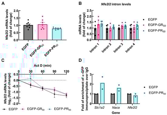 Since the transactivation of ARE-containing genes with DMF depends on newly synthetized NRF2 [], we examined the transcription, splicing and stability of Nfe2l2 mRNA. NSC34 cells were transiently transfected with EGFP, EGFP-GR50 or EGFP-PR50. At 48 h following transfection, no change was found in immature or mature mRNA levels of Nfe2l2 when comparing samples from EGFP-GR50 and EGFP-PR50 to EGFP cells (Figure 5A,B). The degradation rate of Nfe2l2 mRNA was also analyzed using an actinomycin D chase assay. Gene transcription was blocked with 5 µg/mL actinomycin D and the levels of Nfe2l2 were measured with qRT-PCR. As shown in Figure 5C, Nfe2l2 mRNA exhibited a half-life of 85 min in EGFP [], which was not altered by the overexpression of EGFP-GR50 or EGFP-PR50. We also analyzed whether the Arg-DPRs nuclear aggregates might sequester the Nfe2l2 transcripts. We performed RNA immunoprecipitation by employing anti-GFP or control IgG antibody, and the levels of Nfe2l2 mRNA bound in the immunocomplexes were determined with qRT-PCR. As shown in Figure 5D, Slc1a2 and Naca transcripts, used as controls [], were enriched in EGFP-PR50 immunoprecipitates compared to the EGFP. In contrast, Nfe2l2 mRNA was not enriched in the same complexes.