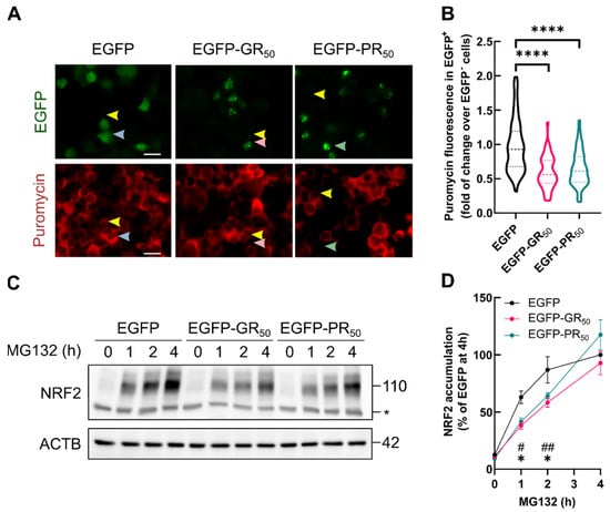Then, we used a SUnSET assay [] to evaluate protein translation in EGFP, EGFP-GR50 or EGFP-PR50 expressing cells. Transfected cells were treated with 1 µg/mL puromycin for 1 h. During this period, puromycin is incorporated into the C-terminus of nascent proteins; then, its levels can be detected by immunocytochemistry. As shown in Figure 6A,B, puromycin fluorescence was diminished in EGFP-GR50 and EGFP-PR50 expressing cells compared to EGFP. These data are in line with previous reports [,], supporting the fact that Arg-DPRs lead to a decrease in general protein synthesis. Then, we blocked NRF2 proteasomal degradation to specifically determine the impact of Arg-DPRs on NRF2 protein synthesis. NSC34 transfected with EGFP, EGFP-GR50 or EGFP-PR50 were submitted to MG132 at the indicated times. As shown in Figure 6C,D, NRF2 levels increased as expected in EGFP-overexpressing cells; importantly, the expression of EGFP-GR50 or EGFP-PR50 resulted in significantly smaller NRF2 accumulation. Taken together, these data indicate that the translational impairment induced by Arg-DPRs directly impacts NRF2 synthesis, resulting in reduced transcriptional activity.