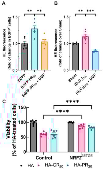 Activation of NRF2 rescues from DPRs toxicity. (A,B) NSC34 cells were transiently transfected with EGFP, EGFP-GR50 or EGFP-PR50 for 48 h or the expression of the Sham cassette or the (G4C2)102 cassette was induced for 7 days with 1 µg/mL tetracycline in NSC34 cells, respectively. Cells were treated with either VEH (DMSO 0.1%) or DMF 100 µM over the last 4 h and stained with 2 µM hydroethidine during the last hour. Probe intensity was measured by flow cytometry analysis. In (A,B), each point depicts the geometric mean of probe fluorescence in cells from that sample (A), alive EGFP+ cells, (B), all alive cells). (C) NSC34 cells were transduced with either control lentiviral particles or encoding the stable NRF2 version lacking the ETGE KEAP1-binding motif for 48 h and then treated with 6 µM of HA, HA-GR20 or HA-PR20 peptides for 24 h. Cell viability was measured using a MTT assay Bar height indicates the mean of the whole group and error bars indicate the SEM. Statistical analysis was performed with one-way ANOVA (A,B), Dunnett’s post-hoc test or two-way ANOVA (C), Bonferroni’s post-hoc test. ** p < 0.01; ***, p < 0.001; ****, p < 0.0001.