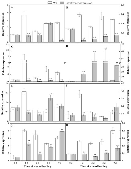 The interference expression of StMSD downregulated the gene expression of most StSODs genes during healing ((A): StCSD1; (B): StCSD2; (C): StCSD3; (D): StCCS; (E): StFSD1; (F): StFSD2; (G): StFSD3; (H): StMSD). The potato elongation factor 1-alpha 1 (efla) was used as an internal control to normalize the data. Bars indicate standard deviation (±SD). Asterisks represent significant differences (* p < 0.05; ** p < 0.01). Each column represents the mean of three replicates. The healing was carried out at ambient temperature (20–25 °C; RH 80–90%) in the dark. The four RNAi lines were used in the experiment.