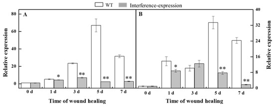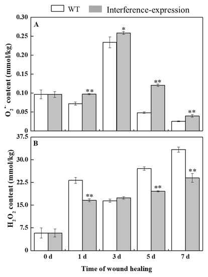 The interference expression of StMSD inhibited the disproportionation of O2•− (A) to H2O2 (B) in tubers during healing. Bars indicate standard deviation (± SD). Asterisks represent significant differences (* p < 0.05; ** p < 0.01). Each column represents the mean of three replicates. The healing was carried out at ambient temperature (20–25 °C; RH 80–90%) in the dark. The four RNAi lines were used in the experiment.