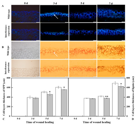 The interference expression of StMSD resulted in the less deposition of SPP (A,C) and lignin (B,D) at wounds of tubers during healing (arrows point at the SPP and lignin). Magnification = 10×, scale bar = 200 μm. Bars indicate standard deviation (±SD). Asterisks represent significant differences (* p < 0.05; ** p < 0.01). Each column represents the mean of three replicates. The healing was carried out at ambient temperature (20–25 °C; RH 80–90%) in the dark. The RNAi line IntLn-1 was used in the experiment.