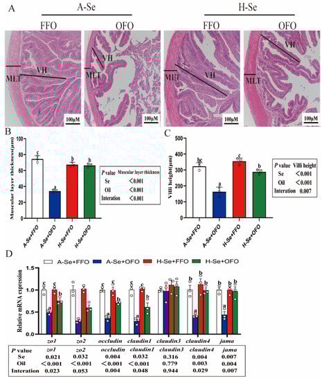 High levels of selenium alleviated the damage that was induced by oxidizing fish oils in the intestine of yellow catfish. (A) H and E staining. (B) Quantification of intestinal muscular layer thickness. (C) Quantification of intestinal villi length. (D) The mRNA levels of intestinal barrier. All data were mean ± SEM (n = 3). “a–c” indicate meaningfulness at p < 0.05. p value was calculated by two-way ANOVA. MLT, muscular layer thickness; VH, villi height.