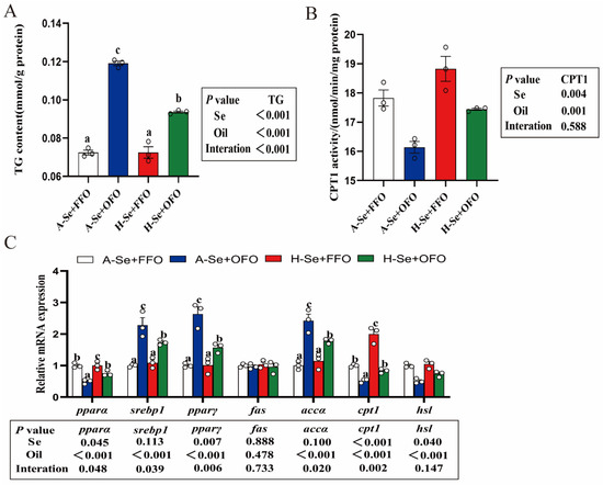 Next, we investigated the effects of oxidized fish oils and selenium on intestinal lipid deposition and metabolism. Oxidized fish oils enhanced the TG content and induced lipid deposition in the intestine (Figure 2A), inhibited the activity of lipolytic enzyme CPT1 (Figure 2B), and up-regulated the lipogenic genes srebp1, pparγ, and accα mRNA abundance, but they significantly reduced the mRNA abundance of lipolytic genes pparα, cpt1, and hsl (Figure 2C). These results suggested that dietary oxidized fish oils increased the lipid content by enhancing lipogenesis and inhibiting lipolysis. On the other hand, a high level of dietary selenium alleviated the oxidized fish oil-induced increment of the TG content and the mRNA abundances of the lipogenic genes (srebp1, pparγ, and accα), and the abrogated oxidized fish oil-induced reduction of CPT1 activity and the mRNA expression of lipolytic genes (pparα and cpt1). Thus, selenium and oxidized fish oils interacted to affect the intestinal lipid metabolism by altering the mRNA abundance and the enzyme activity in both of the intestinal lipogenic and lipolytic pathways.