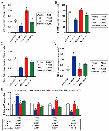 High levels of selenium attenuate the oxidative stress that was induced by oxidized fish oils in the intestine of yellow catfish. (A) CAT activity. (B) T-SOD activity. (C) T-AOC. (D) MDA content. (E) The genes mRNA expression related to oxidative stress. All data were mean ± SEM (n = 3). “a–d” indicate meaningfulness at p < 0.05. p value was calculated by two-way ANOVA. CAT, catalase; T-SOD, total superoxide dismutase; MDA, malondialdehyde.