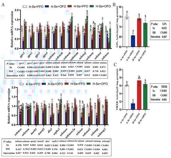 Selenium and oxidized fish oils interacted to affect the mRNA abundance of several selenoproteins, such as gpx1, selenof, selenon, selenoi, selenoo, selenoe, msrb1, sephs2, selenot, selenot2 and selenop in the intestine. Dietary oxidized fish oils decreased the mRNA abundance of these selenoproteins that are mentioned above, and a high level of selenium alleviated the oxidized fish oil-induced down-regulation of their mRNA abundance (Figure 4A). Dietary oxidized fish oils reduced the GPx and TRXR activities, and a high level of dietary Se addition alleviated these changes which were induced by oxidized fish oils (Figure 4B,C). Thus, selenium and oxidized fish oils interacted to affect the redox homeostasis in the intestine.