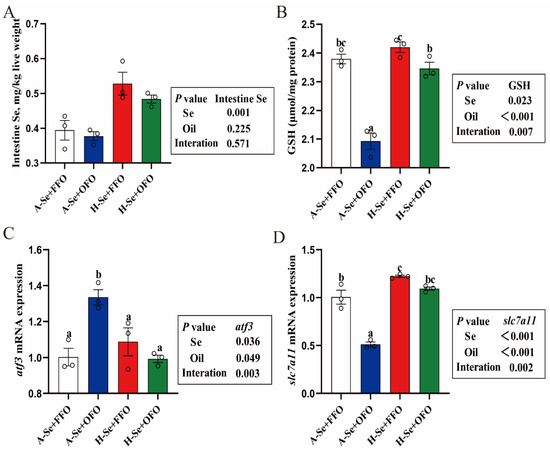 Effect of selenium and oxidized fish oil on Se content and GSH content in the intestine of yellow catfish. (A) Se content. (B) GSH. (C) The expression of atf3 mRNA. (D) The expression of slc7a11 mRNA. All data were mean ± SEM (n = 3). “a–c” indicate significant differences at p < 0.05. p value was calculated by two-way ANOVA.