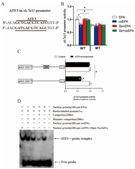 Se and oxEPA affected the SLC7A11 activity by altering the DNA binding capacity of ATF3 to the SLC7A11 promoter in the HEK293T cells. (A) Predicted binding site. (B) slc7a11 activity assays. (C) The luciferase activity assays of predicted ATF3 site after site-directed mutagenesis in the slc7a11 promoter in the HEK293T cells that were treated with an ATF3 overexpression for 24 h. (D) EMSA of the predicted binding sequence for slc7a11 promoter for 24 h in the HEK293T cells. All data were mean ± SEM (n = 3). “*” indicate significant differences at p < 0.05. p value was calculated by Student’s t-test. ATF3, activating transcription factor 3. EPA, eicosapentaenoic acid; MT, mutant type; oxEPA, oxidized eicosapentaenoic acid; SLC7A11, recombinant Solute Carrier Family 7, Member 11; WT, wild type.