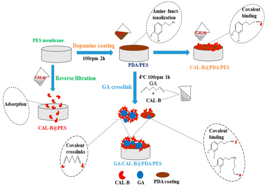 GA/CAL-B@PDA/PES: 10 mL of 2.5–12.5% GA solution and 10 mL of CAL-B solution (0.18–1.08 mg/mL, prepared with a phosphate buffer, pH = 7) were mixed and reacted at 4 °C and 100 rpm for 0–2 h. After the reaction, all the GA/CAL-B solution was added into the filtration cell of the above modified PDA/PES membrane for CAL-B immobilization at 1–4 bar and 100 rpm agitation. Subsequently, 10 mL of PBS buffer solution (pH = 7) was used to wash the unstable enzyme at 2 bar, to obtain the GA/CAL-B@PDA/PES.