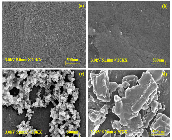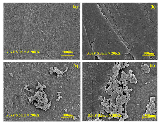 The SEM images of (a) new membranes, (b) CAL-B@PES, (c) CAL-B@PDA/PES, and (d) GA/CAL-B@PDA/PES are displayed in Figure 2. Compared with the new membrane, Figure 2b–d shows fibers with sporadic globules of immobilized CAL-B on the membrane support layer, indicating the stable immobilization of CAL-B on the new membrane. Moreover, Figure 2d illustrates more and larger sporadic globules of immobilized CAL-B than Figure 2c, on account of the aggregation of GA crosslinked CAL-B, increasing the enzyme loading on the membrane.