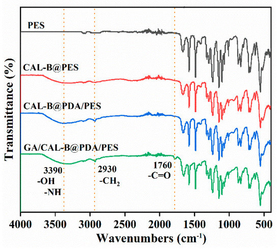 The functional group changes of the new membrane, CAL-B@PES, CAL-B@PDA/PES and GA/CAL-B@PDA/PES were analyzed by FTIR spectrum (Figure 3). In comparison with the new membrane, CAL-B@PES had a new peak value at 3390 cm−1, which belonged to the stretching vibration of -NH and -OH groups, confirming the successful immobilization of CAL-B on the membrane [13]. Furthermore, compared with CAL-B@PES, the peak stretching vibration of PDA-coated CAL-B@PDA/PES enhanced at 3390 cm−1, and some new bands appeared at the range of -CH2 (2930 cm−1), which provided evidence for the successful PDA coating on the new membrane [37]. The characteristic peak of carbonyl group appeared in GA/CAL-B@PDA/PES at 1760 cm−1, implying that GA was successfully adhered to PDA/PES membrane [33].