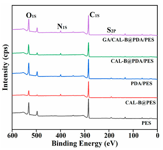 Table 1 shows the element composition for the different BLIMs. Compared with the new membrane, the concentrations of sulfur and nitrogen on the surface of CAL-B@PES increased to 0.44% and 5.12%, respectively, implying that CAL-B successfully immobilized on the membrane. Similarly, the appearance of nitrogen element on the surface of PDA/PES membrane was due to the presence of oxygen element and nitrogen element in PDA itself, which also confirmed the stable PDA coating on the new membrane [38]. Additionally, after being coated by PDA, the higher concentrations of oxygen and nitrogen for CAL-B@PDA/PES and GA/CAL-B@PDA/PES were derived from the successful immobilization of CAL-B, thus, PDA coating and GA crosslinking can be utilized for BLIM fabrication.