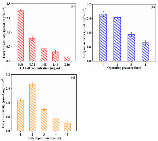 Enzyme activity of CAL-B@PDA/PES at different fabrication operating conditions: (a) CAL-B concentration, (b) operating pressure, and (c) PDA deposition time.