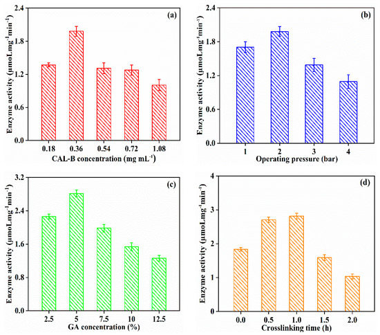 Enzyme activity of GA/CAL-B@PDA/PES at different fabrication operating conditions: (a) CAL-B concentration, (b) operating pressure, (c) GA concentration, and (d) crosslinking time.