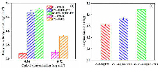 Figure 8a depicts the enzyme activity of free CAL-B and the three BLIMs. In most cases, the enzyme activity decreased after immobilization, because of the structural change of the enzyme, resulting in the modification of catalytic amino acid residues [41]. Nevertheless, the enzyme activity significantly improved after immobilization, thus, the enzyme activity center became a hydrophobic pocket inside the enzyme molecule. After enzyme immobilization on the hydrophilic PDA layer or membrane support layer, the membrane surface became hydrophobic and the substrate was more likely to react with the enzyme in the hydrophobic environment. Moreover, GA/CAL-B@PDA/PES had the highest enzyme activity among the fabricated BLIMs, because its immobilization method could better protect the enzyme molecules and improve the enzyme stability [42].
