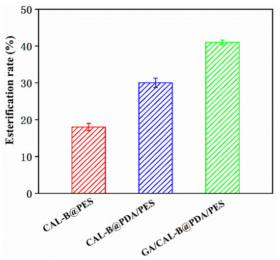 Figure 8b depicts the enzyme loading for the different BLIMs. Due to the additional active site (phenol hydroxyl, provided by the PDA coating layer), which could react with amino group of CAL-B to form a covalent binding [43], CAL-B@PDA/PES possessed the better enzyme loading than that of CAL-B@PES, which only adsorbed the enzyme through van der Waals force and hydrophobic interaction. Furthermore, the enzyme loading of GA/CAL-B@PDA/PES was even higher than that of CAL-B@PDA/PES. With the active functional groups (aldehyde group), GA was grafted onto the PDA coating by Schiff base reaction to furtherly modify the membrane surface, improving the CAL-B immobilization efficiency via crosslinking [32]. Thereby, among the three BLIMs, GA/CAL-B@PDA/PES had better enzyme activity and enzyme loading capacity.