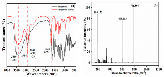 (a) FTIR spectra of hesperidin and hesperidin laurate, and (b) HRMS of hesperidin laurate.