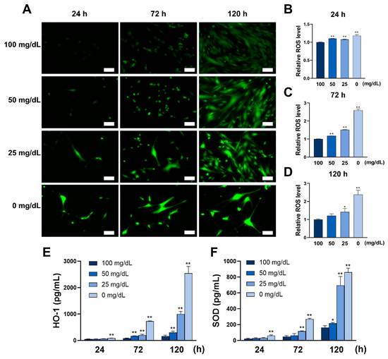 The effects of four different glucose concentrations on ROS were measured after culturing for 24, 72, and 120 h. As shown in Figure 1, ROS levels increased significantly in all stimulation groups (50, 25, and 0 mg/dL), peaking at 120 h. The anti-ROS ability was measured by the secretion of HO-1 and SOD. The anti-ROS ability increased proportionately with the glucose concentration.