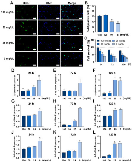 Low glucose conditions affect the cellular viability and promote the expression of inflammatory cytokines in HGnFs. (A,B) Representative immunofluorescence images of BrdU were incorporated into DNA, and the nuclei were stained by DAPI. The quantitative analysis of BrdU-positive cells was presented as mean ± SD of three independent experiments. (C) Cell survival was measured using an MTT assay. The average of the absorbance of each group at 0 h was used as 100% to calculate the relative results. (D–L) The mRNA expression of inflammatory cytokines, such as IL-1β, IL-6, and IL-8, was determined using real-time PCR in stimulated HGnFs incubated for 72 h. (Scale bars: 100 μm; a significant increase compared with the control was described as ** p < 0.01; a significant decrease compared with the control was described as †† p < 0.01.).