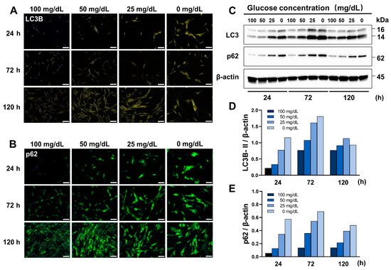 The HGnFs were seeded in 24-well microplates at 1 × 103 cells/mL in a 1 mL culture medium and allowed to adhere for 24 h. The medium was replaced with a medium containing different glucose concentrations (100, 50, 25, and 0 mg/dL). Following 24, 72, or 120 h of incubation, the cells were fixed, permeabilized, and blocked, and then were incubated overnight at 4 °C with 250-times diluted, primary mouse, primary antibodies against LC3B and p62.