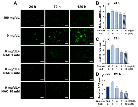 Effect of NAC on ROS formation and anti-ROS ability under low glucose conditions. (A) The total ROS of the HGnFs was stained and photographed under a fluorescence microscope after adding 1, 5, and 10 mM NAC and incubating for 24, 72, and 120 h. (B–D) Total ROS levels after 24, 72, and 120 h of incubation with 1, 5, and 10 mM of NAC were measured using a fluorescent microplate reader, and the results were modified relative to 100 mg/dL (control group). (Scale bars: 100 μm; a significant increase compared with the control was described as ** p < 0.01; a significant decrease compared with the 0 mg/dL was described as † p < 0.05, †† p < 0.01).