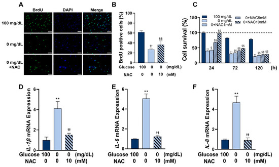 As shown in Figure 5, cell proliferation and survival were also measured under glucose starvation conditions, with a significant rescue of cell proliferation and survival by NAC and the best rescue occurring at a NAC concentration of 10 mM. Moreover, the administration of NAC significantly inhibited the gene expression of IL-1β, IL-6, and IL-8 as inflammatory cytokines, under glucose starvation conditions after 72 h of incubation.