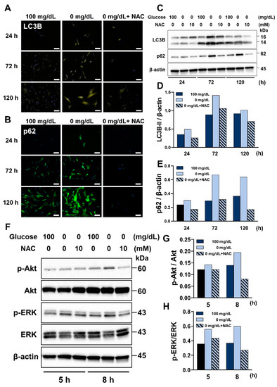 As shown in Figure 6A–E, the effects of NAC treatment under glucose starvation on autophagy-related protein expression in HGnFs were analyzed using Western blot and immunofluorescence staining. LC3B and p62 expression significantly was reduced in the NAC-treated groups at 24, 72, and 120 h compared to that in the control group. Additionally, as shown in Figure 6F,G, after 5 and 8 h of stimulation, glucose starvation conditions significantly increased the phosphating levels of ERK and Akt, and this increase was significantly reduced by NAC administration.