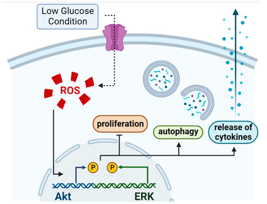 The low glucose environment could increase ROS accumulation. Increased ROS allows for phosphorylation of the Akt signal pathway and ERK pathway, which inhibits cell proliferation, induces cellular autophagy, and increases the expression of inflammatory cytokine.