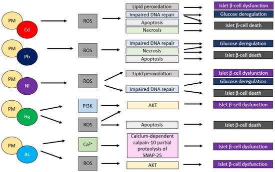 Exposure to fine particulate matter (PM2.5) air pollution originating from the combustion of fossil fuels is closely linked to the induction of both systemic inflammation and oxidative stress among the numerous air pollutants [84]. The postulated mechanism is that fossil fuel particulate matter, particularly coal combustion PM2.5, is high in both metals and sulfur which can produce oxidative stress, and sulfur, which causes acidity, increasing the bioavailability of reactive metals and causing systemic damage [84]. By creating reactive oxygen species (ROS), such as superoxide radicals, hydrogen peroxide, and nitric oxide, toxic metals, As, Cd, Hg, and Pb, can cause oxidative stress. Many metals have been found to enhance lipid peroxidation, or the free radical-driven oxidative alteration of low-density lipoprotein (ox-LDL), a well-known early cause of atherosclerosis [85]. By oxidative pathways, Cd can damage vascular tissues, cause endothelial dysfunction, and promote atherosclerosis. Pb is known to cause the generation of reactive oxygen species (ROS), and Pb-induced oxidative stress can result in protein, nucleic acid, and lipid peroxidation [86]. Cu and Zn imbalances, for example, are required for balanced oxidant-antioxidant pathways, and Cu and Zn imbalances can increase vulnerability to toxic metal-induced oxidative damage to islet cells, leading to insulin resistance pathogenesis. Selenium (Se) is a cofactor of the antioxidant enzyme glutathione peroxidase, which helps to reduce oxidative stress caused by Cd/Pb [87]. The impact of selected heavy metals commonly seen in PM on β-cells and the development of T1DM is presented in Figure 2.